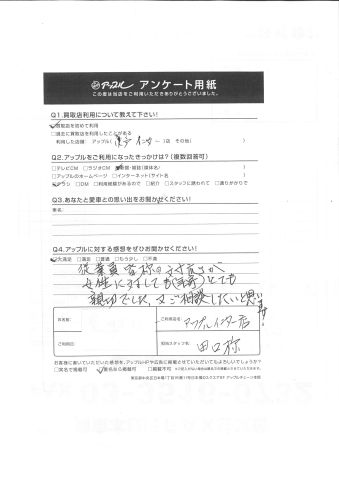 お車のご相談・ 査定だけでもOK! カンタン 入力 30秒 アップルがブランド買取始めました! お電話でも受付中! 受付時間10:00 ~ 18:30 0120-366-310 お車のご相談・ 査定だけでもOK! カンタン 入力 30秒 アップルがブランド買取始めました! お電話でも受付中! 受付時間10:00 ~ 18:30 0120-366-310 アップルがブランド買取始めました! お電話でも受付中! 受付時間10:00 ~ 18:30 0120-366-310 店舗情報 在庫車 スタッフ紹介 ブログ お客様の声 キャンペーン お得 無料査定 click お客様の声 ご記入日: 2017/06/21 K様 Q.アップルに対する感想をぜひお書きください!従業員皆様の対応が女性に対しても(年寄)とても親切でした。又、ご相談したいと思います。担当スタッフ:田口 前へ 次へ お客様の声一覧を見る