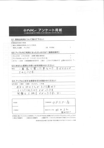 お車のご相談・ 査定だけでもOK! カンタン 入力 30秒 アップルがブランド買取始めました! お電話でも受付中! 受付時間10:00 ~ 18:30 0120-366-310 お車のご相談・ 査定だけでもOK! カンタン 入力 30秒 アップルがブランド買取始めました! お電話でも受付中! 受付時間10:00 ~ 18:30 0120-366-310 アップルがブランド買取始めました! お電話でも受付中! 受付時間10:00 ~ 18:30 0120-366-310 店舗情報 在庫車 スタッフ紹介 ブログ お客様の声 キャンペーン お得 無料査定 click お客様の声 ご記入日: 2017/07/05 S様 Q.あなたと愛車との思い出をお聞かせください!一番長く乗った車なので、手ばなすのはさみしいです。Q.アップルに対する感想をぜひお書きください!担当の田口さんがとても親切でよくしてくれたので、よかったです。笑顔も人柄もよかったです。(^.^)担当スタッフ:田口 前へ 次へ お客様の声一覧を見る