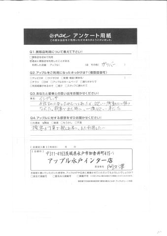 お車のご相談・ 査定だけでもOK! カンタン 入力 30秒 アップルがブランド買取始めました! お電話でも受付中! 受付時間10:00 ~ 18:30 0120-366-310 お車のご相談・ 査定だけでもOK! カンタン 入力 30秒 アップルがブランド買取始めました! お電話でも受付中! 受付時間10:00 ~ 18:30 0120-366-310 アップルがブランド買取始めました! お電話でも受付中! 受付時間10:00 ~ 18:30 0120-366-310 店舗情報 在庫車 スタッフ紹介 ブログ お客様の声 キャンペーン お得 無料査定 click お客様の声 ご記入日: 2017/08/08 M様 Q.あなたと愛車との思い出をお聞かせください!インプレッサ手放すのは少しためらいはあったが、欲しい衝動には勝てなかった。新車で出た時に一番欲しい車だった。Q.アップルに対する感想をぜひお書きください!接客が丁寧で親しみ易い、また利用したい。担当スタッフ:阿久津 前へ 次へ お客様の声一覧を見る