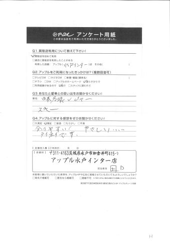 お車のご相談・ 査定だけでもOK! カンタン 入力 30秒 アップルがブランド買取始めました! お電話でも受付中! 受付時間10:00 ~ 18:30 0120-366-310 お車のご相談・ 査定だけでもOK! カンタン 入力 30秒 アップルがブランド買取始めました! お電話でも受付中! 受付時間10:00 ~ 18:30 0120-366-310 アップルがブランド買取始めました! お電話でも受付中! 受付時間10:00 ~ 18:30 0120-366-310 店舗情報 在庫車 スタッフ紹介 ブログ お客様の声 キャンペーン お得 無料査定 click お客様の声 ご記入日: 2017/08/11 H様 Q.あなたと愛車との思い出をお聞かせください!日本各県レジャースキーQ.アップルに対する感想をぜひお書きください!分かりやすいやさしいテイネイです担当スタッフ:田口 前へ 次へ お客様の声一覧を見る