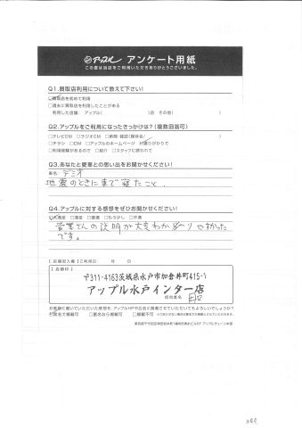 お車のご相談・ 査定だけでもOK! カンタン 入力 30秒 アップルがブランド買取始めました! お電話でも受付中! 受付時間10:00 ~ 18:30 0120-366-310 お車のご相談・ 査定だけでもOK! カンタン 入力 30秒 アップルがブランド買取始めました! お電話でも受付中! 受付時間10:00 ~ 18:30 0120-366-310 アップルがブランド買取始めました! お電話でも受付中! 受付時間10:00 ~ 18:30 0120-366-310 店舗情報 在庫車 スタッフ紹介 ブログ お客様の声 キャンペーン お得 無料査定 click お客様の声 ご記入日: 2017/08/13 梶尾様 Q.あなたと愛車との思い出をお聞かせください!デミオ地震のときに車で寝たことQ.アップルに対する感想をぜひお書きください!営業さんの説明が大変わかりやすかったです。担当スタッフ:田口 前へ 次へ お客様の声一覧を見る