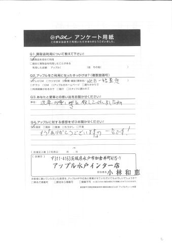 お車のご相談・ 査定だけでもOK! カンタン 入力 30秒 アップルがブランド買取始めました! お電話でも受付中! 受付時間10:00 ~ 18:30 0120-366-310 お車のご相談・ 査定だけでもOK! カンタン 入力 30秒 アップルがブランド買取始めました! お電話でも受付中! 受付時間10:00 ~ 18:30 0120-366-310 アップルがブランド買取始めました! お電話でも受付中! 受付時間10:00 ~ 18:30 0120-366-310 店舗情報 在庫車 スタッフ紹介 ブログ お客様の声 キャンペーン お得 無料査定 click お客様の声 ご記入日: 2017/08/18 E様 Q.あなたと愛車との思い出をお聞かせください!洗車の楽しさを教えてくれましたねQ.アップルに対する感想をぜひお書きください!もう『ありがとうございます』の一言です!担当スタッフ:小林 前へ 次へ お客様の声一覧を見る