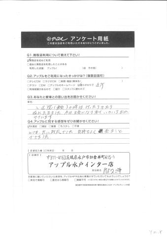 お車のご相談・ 査定だけでもOK! カンタン 入力 30秒 アップルがブランド買取始めました! お電話でも受付中! 受付時間10:00 ~ 18:30 0120-366-310 お車のご相談・ 査定だけでもOK! カンタン 入力 30秒 アップルがブランド買取始めました! お電話でも受付中! 受付時間10:00 ~ 18:30 0120-366-310 アップルがブランド買取始めました! お電話でも受付中! 受付時間10:00 ~ 18:30 0120-366-310 店舗情報 在庫車 スタッフ紹介 ブログ お客様の声 キャンペーン お得 無料査定 click お客様の声 ご記入日: 2017/08/24 Y.K様 Q.あなたと愛車との思い出をお聞かせください!入退院(病気)の時は行ったりきたり役に立ちました。今は元気になり車でいろいろ出かけています。Q.アップルに対する感想をぜひお書きください!とても良い対応でした。気持良く売ることできました。担当スタッフ:阿久津 前へ 次へ お客様の声一覧を見る
