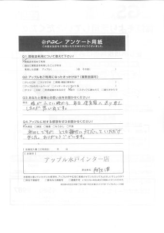 お車のご相談・ 査定だけでもOK! カンタン 入力 30秒 アップルがブランド買取始めました! お電話でも受付中! 受付時間10:00 ~ 18:30 0120-366-310 お車のご相談・ 査定だけでもOK! カンタン 入力 30秒 アップルがブランド買取始めました! お電話でも受付中! 受付時間10:00 ~ 18:30 0120-366-310 アップルがブランド買取始めました! お電話でも受付中! 受付時間10:00 ~ 18:30 0120-366-310 店舗情報 在庫車 スタッフ紹介 ブログ お客様の声 キャンペーン お得 無料査定 click お客様の声 ご記入日: 2018/01/30 D様 Q.あなたと愛車との思い出をお聞かせください!娘が小さい時から、毎日保育園へ送り迎えしたのが思い出です。Q.アップルに対する感想をぜひお書きください!初めてですが、とても親切に対応していただけました。ありがとうございます。担当スタッフ:阿久津 前へ 次へ お客様の声一覧を見る