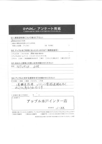 お車のご相談・ 査定だけでもOK! カンタン 入力 30秒 アップルがブランド買取始めました! お電話でも受付中! 受付時間10:00 ~ 18:30 0120-366-310 お車のご相談・ 査定だけでもOK! カンタン 入力 30秒 アップルがブランド買取始めました! お電話でも受付中! 受付時間10:00 ~ 18:30 0120-366-310 アップルがブランド買取始めました! お電話でも受付中! 受付時間10:00 ~ 18:30 0120-366-310 店舗情報 在庫車 スタッフ紹介 ブログ お客様の声 キャンペーン お得 無料査定 click お客様の声 ご記入日: 2018/02/13 F様 Q.あなたと愛車との思い出をお聞かせください!フェアレディZ34Q.アップルに対する感想をぜひお書きください!1度来店後、しつこい電話連絡もなく、ゆっくりと考えられたです。担当スタッフ:小林 前へ 次へ お客様の声一覧を見る