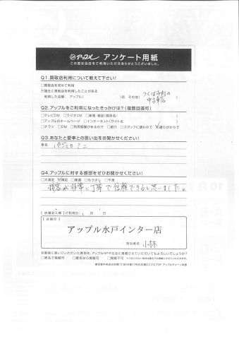 お車のご相談・ 査定だけでもOK! カンタン 入力 30秒 アップルがブランド買取始めました! お電話でも受付中! 受付時間10:00 ~ 18:30 0120-366-310 お車のご相談・ 査定だけでもOK! カンタン 入力 30秒 アップルがブランド買取始めました! お電話でも受付中! 受付時間10:00 ~ 18:30 0120-366-310 アップルがブランド買取始めました! お電話でも受付中! 受付時間10:00 ~ 18:30 0120-366-310 店舗情報 在庫車 スタッフ紹介 ブログ お客様の声 キャンペーン お得 無料査定 click お客様の声 ご記入日: 2018/03/06 H様 Q.あなたと愛車との思い出をお聞かせください!パジェロミニQ.アップルに対する感想をぜひお書きください!接客が非常に丁寧で信頼できると思いました。担当スタッフ:小林 前へ 次へ お客様の声一覧を見る