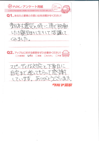 お車のご相談・ 査定だけでもOK! カンタン 入力 30秒 アップルがブランド買取始めました! お電話でも受付中! 受付時間10:00 ~ 18:30 0120-366-310 お車のご相談・ 査定だけでもOK! カンタン 入力 30秒 アップルがブランド買取始めました! お電話でも受付中! 受付時間10:00 ~ 18:30 0120-366-310 アップルがブランド買取始めました! お電話でも受付中! 受付時間10:00 ~ 18:30 0120-366-310 店舗情報 在庫車 スタッフ紹介 ブログ お客様の声 キャンペーン お得 無料査定 click お客様の声 ご記入日: 2013/04/29 K.S様 東日本大震災の時に車で移動したり寝泊りしたりして活躍してくれました。スピーディな対応と下取り日に自宅まで送ってもらって感謝しています。ありがとうございます。 前へ 次へ お客様の声一覧を見る