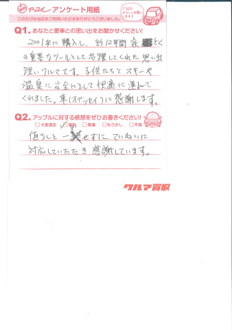 お車のご相談・ 査定だけでもOK! カンタン 入力 30秒 アップルがブランド買取始めました! お電話でも受付中! 受付時間10:00 ~ 18:30 0120-366-310 お車のご相談・ 査定だけでもOK! カンタン 入力 30秒 アップルがブランド買取始めました! お電話でも受付中! 受付時間10:00 ~ 18:30 0120-366-310 アップルがブランド買取始めました! お電話でも受付中! 受付時間10:00 ~ 18:30 0120-366-310 店舗情報 在庫車 スタッフ紹介 ブログ お客様の声 キャンペーン お得 無料査定 click お客様の声 ご記入日: 2013/06/06 G.H様 2001年に購入し、約12年間家族の重要なツールとして活躍してくれた思いで深いクルマです。子供たちとスキーや温泉に安全にそして快適に運んでくれました。車(オデッセイ)に感謝します。値なしとせずに、ていねいに対応していただき、感謝しています。 前へ 次へ お客様の声一覧を見る