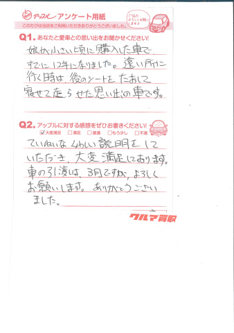 お車のご相談・ 査定だけでもOK! カンタン 入力 30秒 アップルがブランド買取始めました! お電話でも受付中! 受付時間10:00 ~ 18:30 0120-366-310 お車のご相談・ 査定だけでもOK! カンタン 入力 30秒 アップルがブランド買取始めました! お電話でも受付中! 受付時間10:00 ~ 18:30 0120-366-310 アップルがブランド買取始めました! お電話でも受付中! 受付時間10:00 ~ 18:30 0120-366-310 店舗情報 在庫車 スタッフ紹介 ブログ お客様の声 キャンペーン お得 無料査定 click お客様の声 ご記入日: 2013/06/28 M.K様 娘が小さい頃に購入した車ですでに12年になりました。遠い所に行く時は、後ろのシートをたおして寝せて走らせた思い出の車です。ていねいな、くわしい説明をしていただき、大変満足しております。車の引渡しは、3月ですがよろしくお願いします。ありがとうございました。 前へ 次へ お客様の声一覧を見る