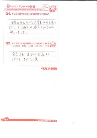 お車のご相談・ 査定だけでもOK! カンタン 入力 30秒 アップルがブランド買取始めました! お電話でも受付中! 受付時間10:00 ~ 18:30 0120-366-310 お車のご相談・ 査定だけでもOK! カンタン 入力 30秒 アップルがブランド買取始めました! お電話でも受付中! 受付時間10:00 ~ 18:30 0120-366-310 アップルがブランド買取始めました! お電話でも受付中! 受付時間10:00 ~ 18:30 0120-366-310 店舗情報 在庫車 スタッフ紹介 ブログ お客様の声 キャンペーン お得 無料査定 click お客様の声 ご記入日: 2013/09/08 K.T様 千葉に住んでいた大学生の息子達の所へ、引越しや様子をみるのに通いました。突然でもすばやく対応してくださり、よかったです。 前へ 次へ お客様の声一覧を見る