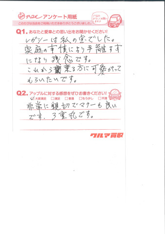 お車のご相談・ 査定だけでもOK! カンタン 入力 30秒 アップルがブランド買取始めました! お電話でも受付中! 受付時間10:00 ~ 18:30 0120-366-310 お車のご相談・ 査定だけでもOK! カンタン 入力 30秒 アップルがブランド買取始めました! お電話でも受付中! 受付時間10:00 ~ 18:30 0120-366-310 アップルがブランド買取始めました! お電話でも受付中! 受付時間10:00 ~ 18:30 0120-366-310 店舗情報 在庫車 スタッフ紹介 ブログ お客様の声 キャンペーン お得 無料査定 click お客様の声 ご記入日: 2013/09/03 T.S様 レガシーは私の宝でした。家庭の事故により手放す事になり残念です。これから乗る方に可愛がってもらいたいです。非常に親切でマナーも良いです。3重丸です。 前へ 次へ お客様の声一覧を見る