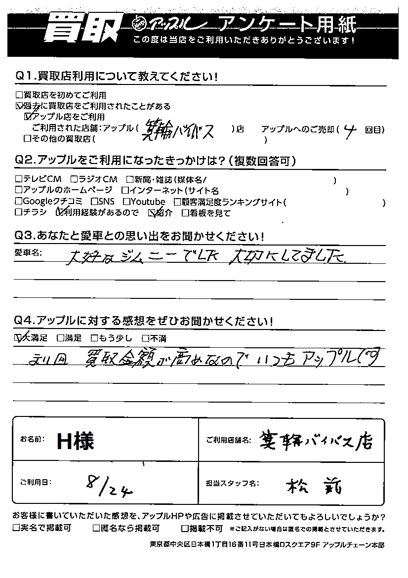 H様 車名:スズキ ジムニー