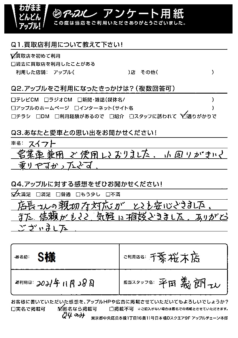 S様 車名:スズキ スイフト