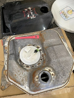 ガソリンタンクを外し、腐敗したガソリンを抜き、錆を落として