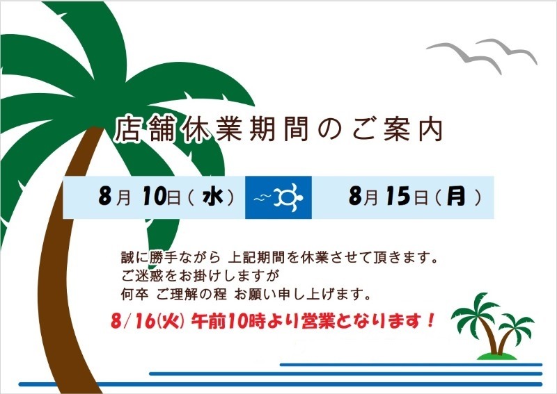 8/10㈬~815㈪は夏季休業とさせて頂きます。