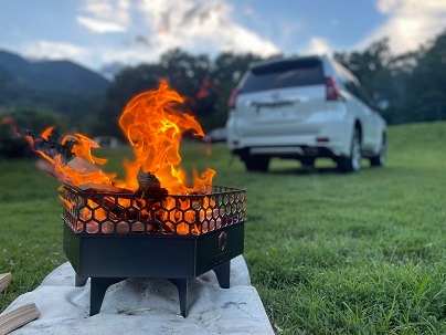 焚き火台に火を起こすべくみんなで斧で薪割りやら