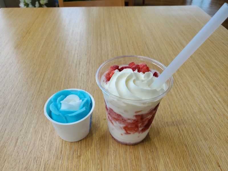 カフェに行ってイチゴの飲み物とネモフィラを模したアイスを食べました。