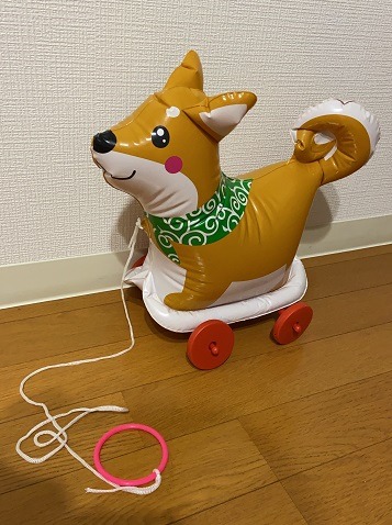 紐を引っ張ると足の部分がが回って散歩出来るワンコ