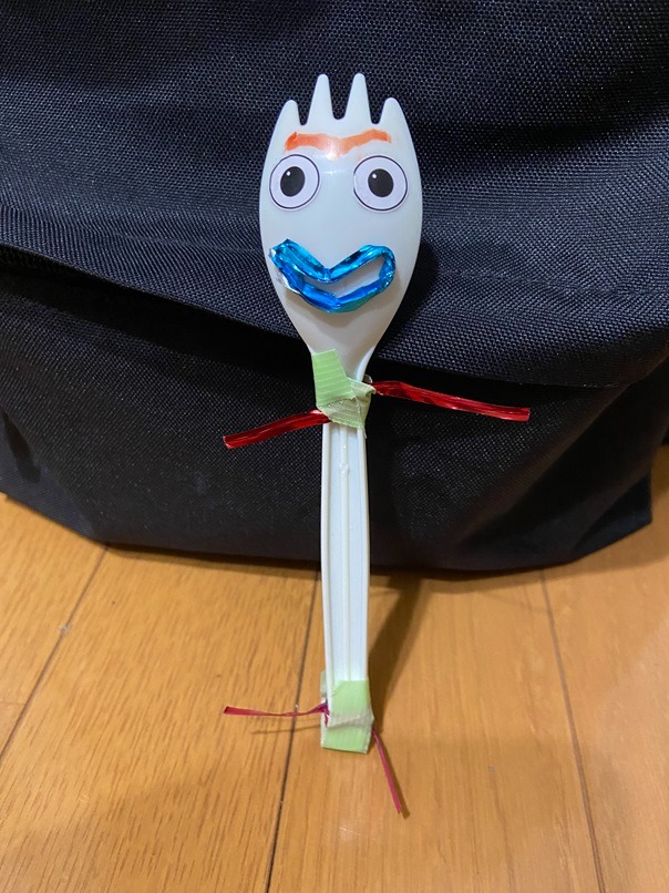 先割れスプーンに目や口を付けて