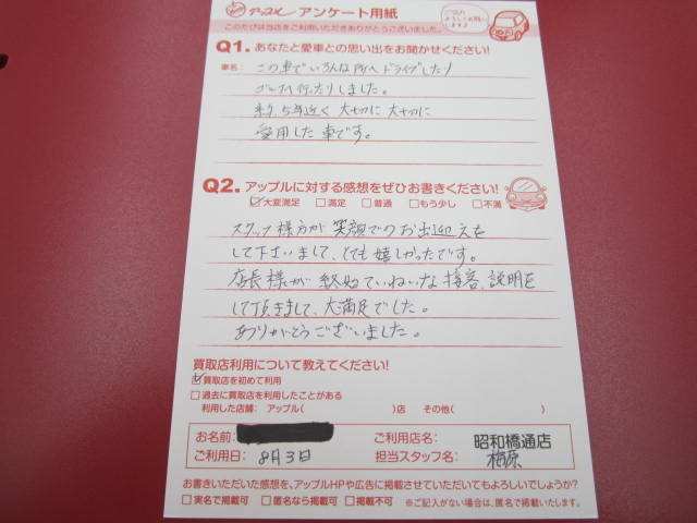 お車のご相談・ 査定だけでもOK! カンタン 入力 30秒 アップルがブランド買取始めました! お電話でも受付中! 受付時間10:00 ~ 19:00 052-363-7811 お車のご相談・ 査定だけでもOK! カンタン 入力 30秒 アップルがブランド買取始めました! お電話でも受付中! 受付時間10:00 ~ 19:00 052-363-7811 アップルがブランド買取始めました! お電話でも受付中! 受付時間10:00 ~ 19:00 052-363-7811 店舗情報 在庫車 スタッフ紹介 ブログ お客様の声 キャンペーン 無料査定 click お客様の声 ご記入日: 2013/08/03 匿名希望様 スタッフ様方が笑顔でのお出迎えをして下さいまして、とても嬉しかったです。店長様が終始ていねいな接客、説明をして頂きまして、大満足でした。ありがとうございました。 前へ 次へ お客様の声一覧を見る