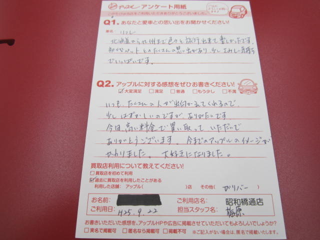 お車のご相談・ 査定だけでもOK! カンタン 入力 30秒 アップルがブランド買取始めました! お電話でも受付中! 受付時間10:00 ~ 19:00 052-363-7811 お車のご相談・ 査定だけでもOK! カンタン 入力 30秒 アップルがブランド買取始めました! お電話でも受付中! 受付時間10:00 ~ 19:00 052-363-7811 アップルがブランド買取始めました! お電話でも受付中! 受付時間10:00 ~ 19:00 052-363-7811 店舗情報 在庫車 スタッフ紹介 ブログ お客様の声 キャンペーン 無料査定 click お客様の声 ご記入日: 2013/12/03 匿名希望リフレ様 いつもたくさんの人が出迎えてくれるので少しはずかしいのですが、ありがたいです。今回高い料金で買い取っていただいてありがとうございます。今までのアップルのイメージがかわりました。大好きになりました。 前へ 次へ お客様の声一覧を見る