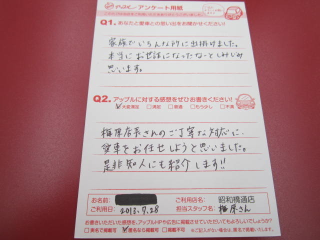 お車のご相談・ 査定だけでもOK! カンタン 入力 30秒 アップルがブランド買取始めました! お電話でも受付中! 受付時間10:00 ~ 19:00 052-363-7811 お車のご相談・ 査定だけでもOK! カンタン 入力 30秒 アップルがブランド買取始めました! お電話でも受付中! 受付時間10:00 ~ 19:00 052-363-7811 アップルがブランド買取始めました! お電話でも受付中! 受付時間10:00 ~ 19:00 052-363-7811 店舗情報 在庫車 スタッフ紹介 ブログ お客様の声 キャンペーン 無料査定 click お客様の声 ご記入日: 2013/12/03 匿名希望様 梅原店長さんのご丁寧な対応に愛車をお任せしようと思いました。是非知人にも紹介します!! 前へ 次へ お客様の声一覧を見る