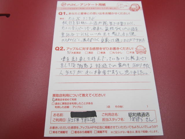 お車のご相談・ 査定だけでもOK! カンタン 入力 30秒 アップルがブランド買取始めました! お電話でも受付中! 受付時間10:00 ~ 19:00 052-363-7811 お車のご相談・ 査定だけでもOK! カンタン 入力 30秒 アップルがブランド買取始めました! お電話でも受付中! 受付時間10:00 ~ 19:00 052-363-7811 アップルがブランド買取始めました! お電話でも受付中! 受付時間10:00 ~ 19:00 052-363-7811 店舗情報 在庫車 スタッフ紹介 ブログ お客様の声 キャンペーン 無料査定 click お客様の声 ご記入日: 2013/12/03 匿名希望タントx-ltd様 車を駐車した時点で、ていねいにあいさつをして頂き車を売る経過での案内も分かりやすく人当たりが良い接客であると思いました。 前へ 次へ お客様の声一覧を見る
