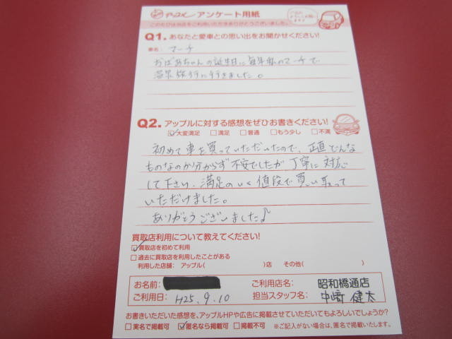 お車のご相談・ 査定だけでもOK! カンタン 入力 30秒 アップルがブランド買取始めました! お電話でも受付中! 受付時間10:00 ~ 19:00 052-363-7811 お車のご相談・ 査定だけでもOK! カンタン 入力 30秒 アップルがブランド買取始めました! お電話でも受付中! 受付時間10:00 ~ 19:00 052-363-7811 アップルがブランド買取始めました! お電話でも受付中! 受付時間10:00 ~ 19:00 052-363-7811 店舗情報 在庫車 スタッフ紹介 ブログ お客様の声 キャンペーン 無料査定 click お客様の声 ご記入日: 2013/12/03 匿名希望マーチ様 初めて車を買っていただいたので、正直どんなものなのか分からず不安でしたが、丁寧に対応して下さり、満足のいく値段で買い取っていただけました。ありがとうございました♪ 前へ 次へ お客様の声一覧を見る