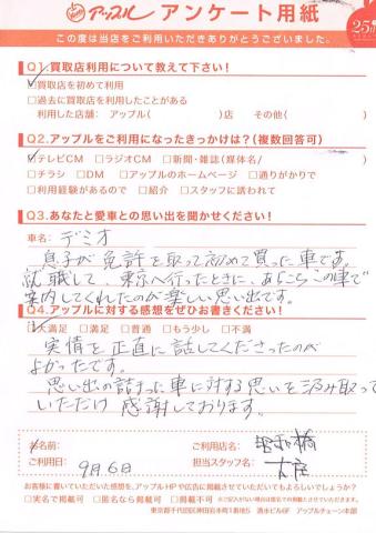 お車のご相談・ 査定だけでもOK! カンタン 入力 30秒 アップルがブランド買取始めました! お電話でも受付中! 受付時間10:00 ~ 19:00 052-363-7811 お車のご相談・ 査定だけでもOK! カンタン 入力 30秒 アップルがブランド買取始めました! お電話でも受付中! 受付時間10:00 ~ 19:00 052-363-7811 アップルがブランド買取始めました! お電話でも受付中! 受付時間10:00 ~ 19:00 052-363-7811 店舗情報 在庫車 スタッフ紹介 ブログ お客様の声 キャンペーン 無料査定 click お客様の声 ご記入日: 2014/09/06 匿名希望デミオ様 実情を正直に話して下さったのが良かったです。思い出の詰まった車に対する思いを汲み取っていただけ、感謝しております。 前へ 次へ お客様の声一覧を見る