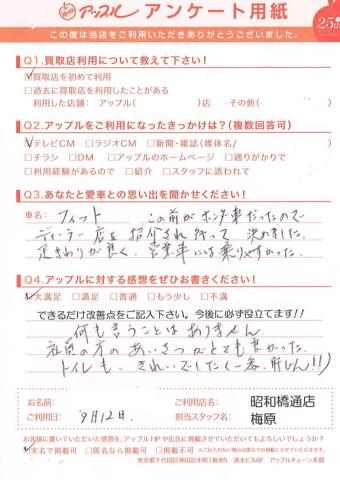 お車のご相談・ 査定だけでもOK! カンタン 入力 30秒 アップルがブランド買取始めました! お電話でも受付中! 受付時間10:00 ~ 19:00 052-363-7811 お車のご相談・ 査定だけでもOK! カンタン 入力 30秒 アップルがブランド買取始めました! お電話でも受付中! 受付時間10:00 ~ 19:00 052-363-7811 アップルがブランド買取始めました! お電話でも受付中! 受付時間10:00 ~ 19:00 052-363-7811 店舗情報 在庫車 スタッフ紹介 ブログ お客様の声 キャンペーン 無料査定 click お客様の声 ご記入日: 2014/09/14 匿名希望ハイゼット様 皆様とても親切にして下さって、とても気持ちよかったです。またお世話になる時はよろしくお願いします。 前へ 次へ お客様の声一覧を見る