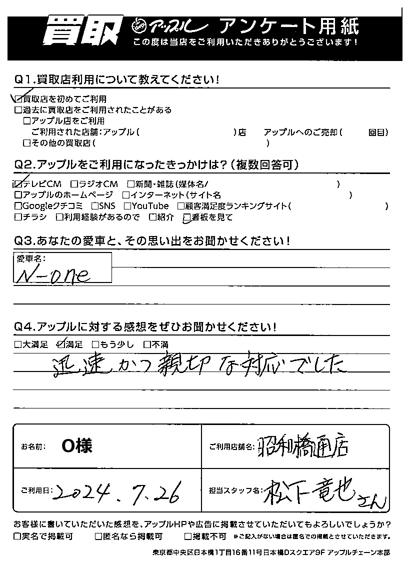 お車のご相談・ 査定だけでもOK! カンタン 入力 30秒 アップルがブランド買取始めました! お電話でも受付中! 受付時間10:00 ~ 19:00 052-363-7811 お車のご相談・ 査定だけでもOK! カンタン 入力 30秒 アップルがブランド買取始めました! お電話でも受付中! 受付時間10:00 ~ 19:00 052-363-7811 アップルがブランド買取始めました! お電話でも受付中! 受付時間10:00 ~ 19:00 052-363-7811 店舗情報 在庫車 スタッフ紹介 ブログ お客様の声 キャンペーン 無料査定 click お客様の声 ご記入日: 2024/09/07 O様 車名:ホンダ N-ONE ご利用日:2024年7月26日 担当:松下アップルに対する感想をぜひお聞かせください!迅速かつ親切な対応でした。 前へ 次へ お客様の声一覧を見る