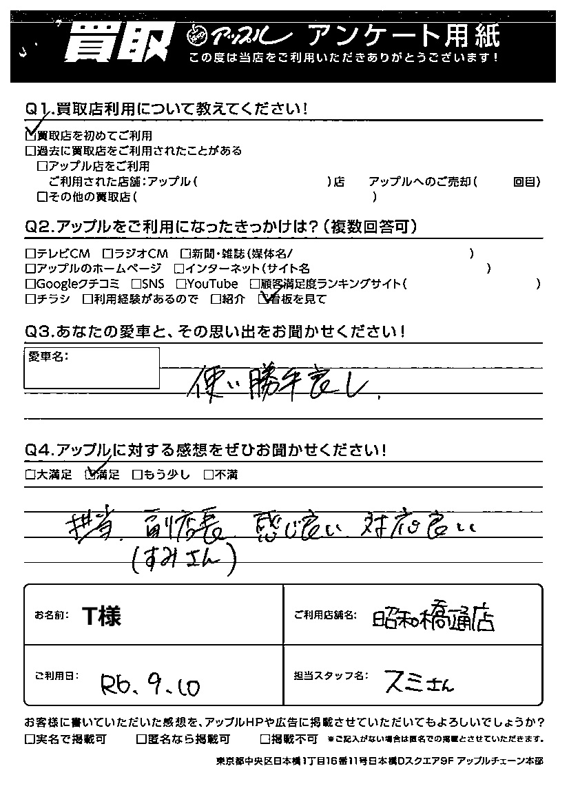 A.担当副店長(すみさん)、感じ良い、対応良い。
