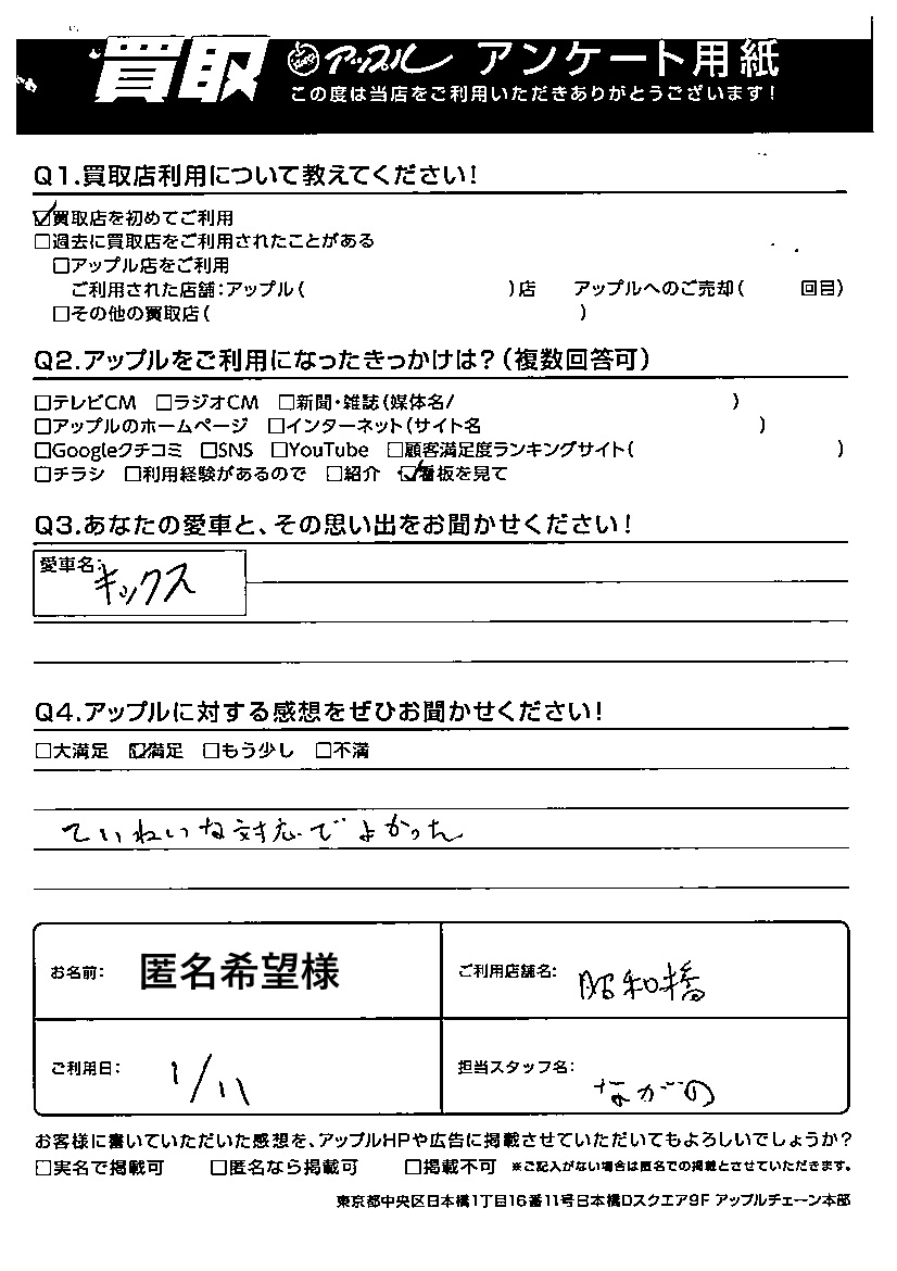 匿名希望様 車名:日産 キックス