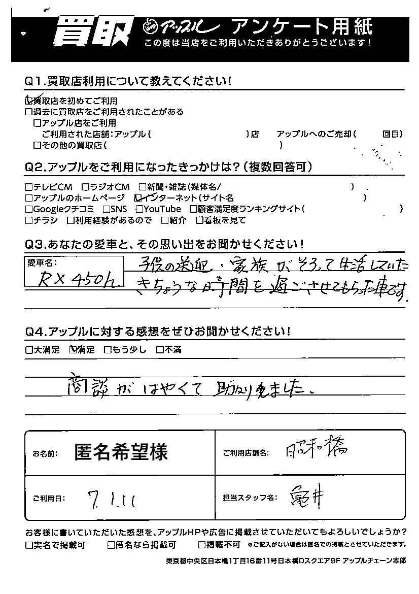 A.愛車名:RX450h 子供の送迎、家族がそろって生活していたきちょうな時間を過ごさせてもらった