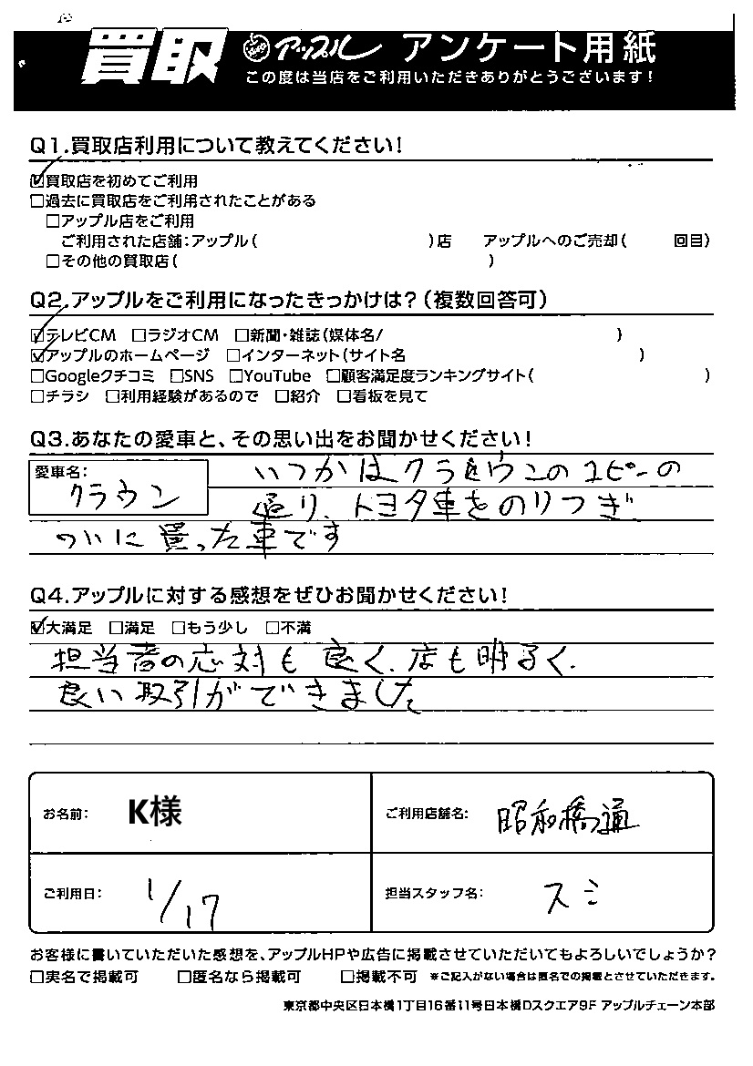K様 車名:トヨタ クラウン(~H11年8月/H30年6月~)