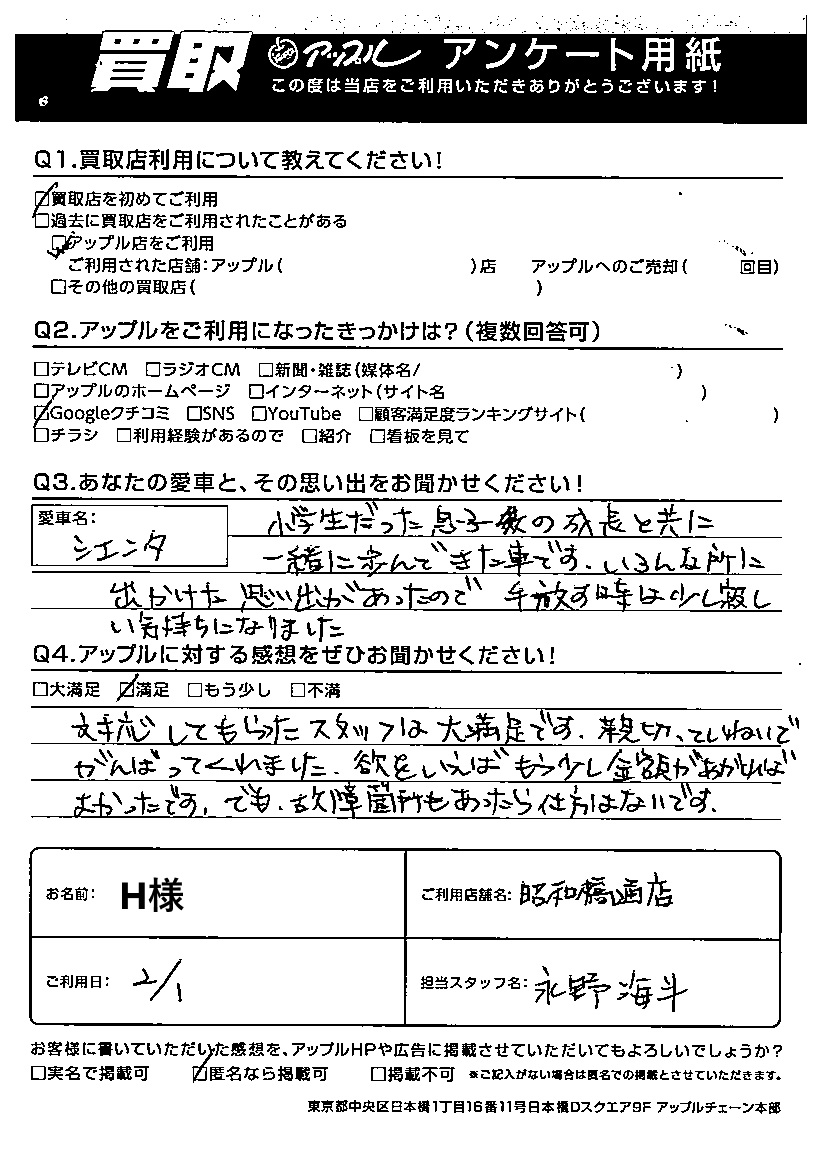 A.愛車名:シエンタ 小学生だった息子の成長と共に一緒に歩んできた車です。いろんな所に出かけ