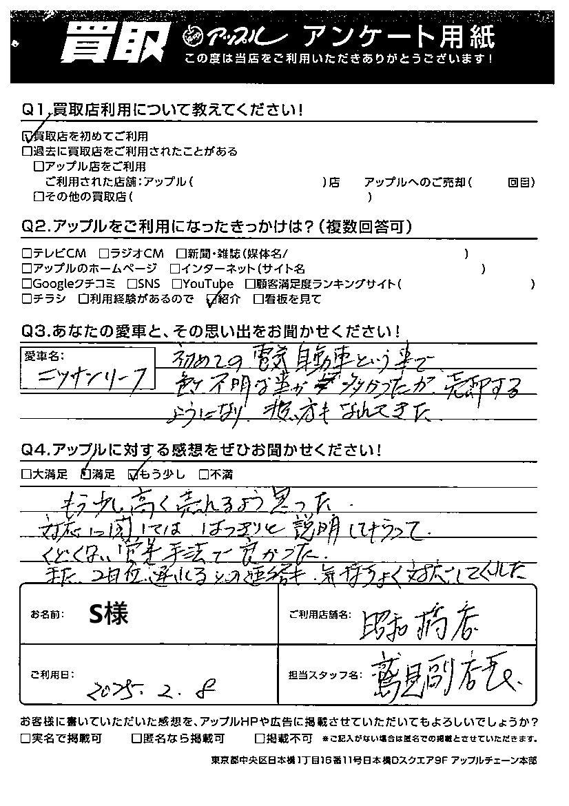 A.愛車名:リーフ 初めての電気自動車という事で、色々不明な事が多かったが、売却するようにな