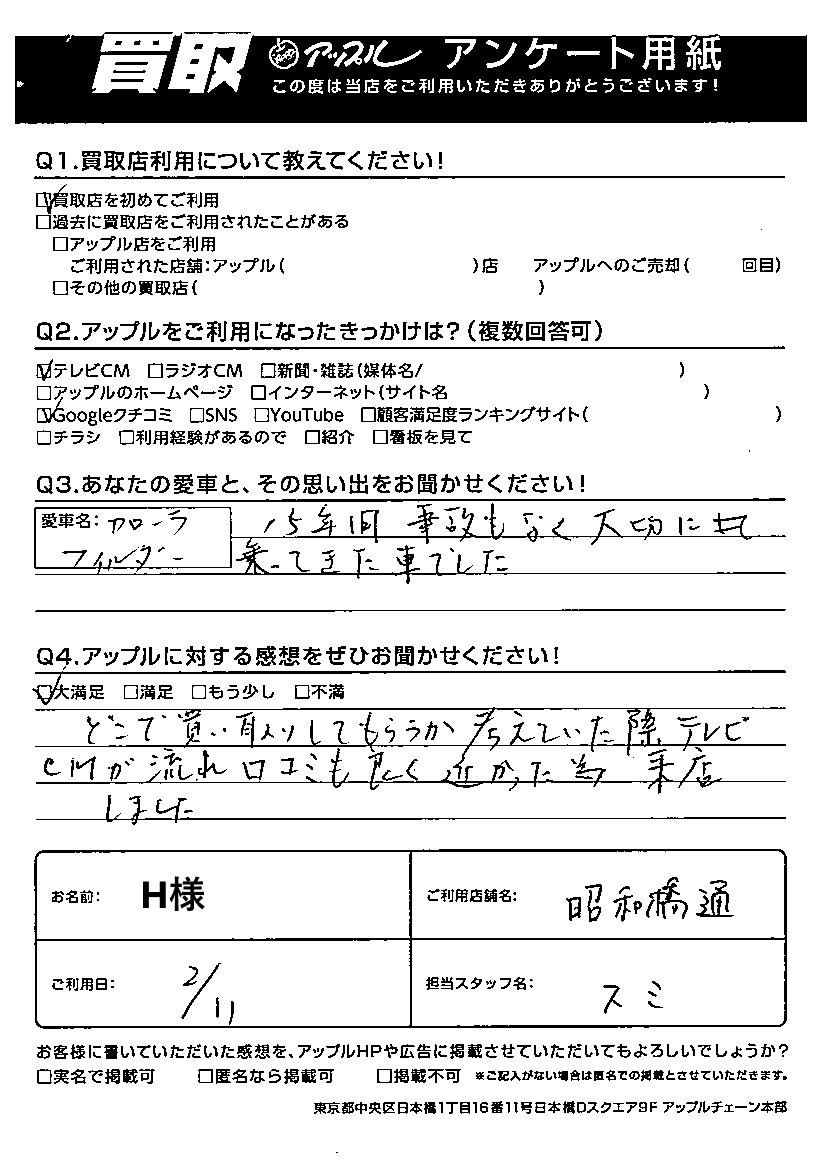 H様 車名:トヨタ カローラフィールダー フィールダー(カローラ)