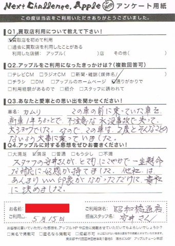 お車のご相談・ 査定だけでもOK! カンタン 入力 30秒 アップルがブランド買取始めました! お電話でも受付中! 受付時間10:00 ~ 19:00 052-363-7811 お車のご相談・ 査定だけでもOK! カンタン 入力 30秒 アップルがブランド買取始めました! お電話でも受付中! 受付時間10:00 ~ 19:00 052-363-7811 アップルがブランド買取始めました! お電話でも受付中! 受付時間10:00 ~ 19:00 052-363-7811 店舗情報 在庫車 スタッフ紹介 ブログ お客様の声 キャンペーン 無料査定 click お客様の声 ご記入日: 2015/05/15 匿名希望カムリ様 スタッフの安井さんがとてもにこやかで、一生懸命な対応に好感が持てました。他社はあんまりいい印象がなかっただけに、貴社に決めました。 前へ 次へ お客様の声一覧を見る