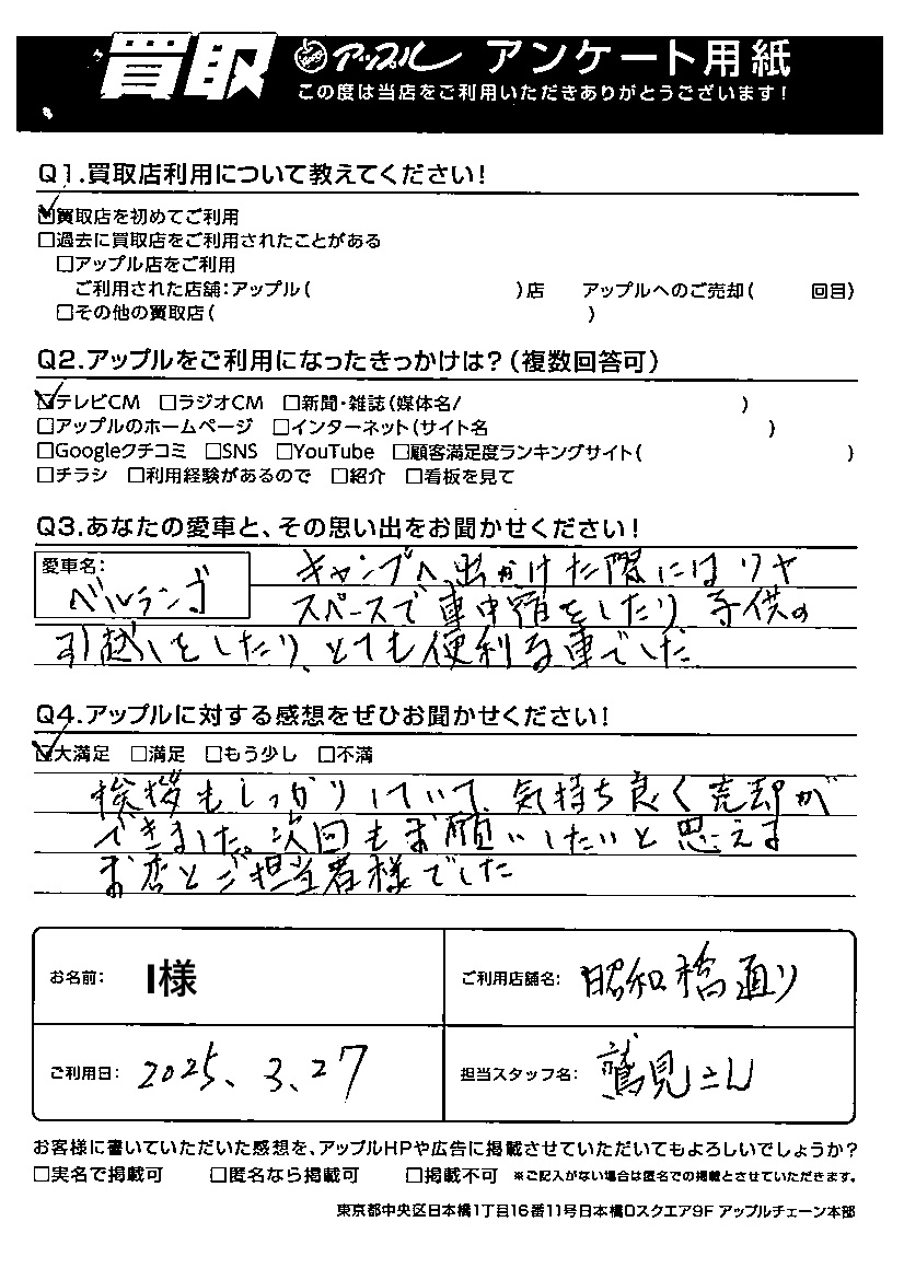 挨拶もしっかりしていて気持ちよく売却ができました。次回もお願いしたいと思えるお店とご担当者様でした。