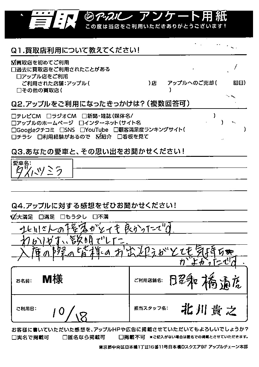北川さんの接客がとても良かったです。わかりやすい説明でした。入庫の際の皆様のお出迎えがとても気持ち良か