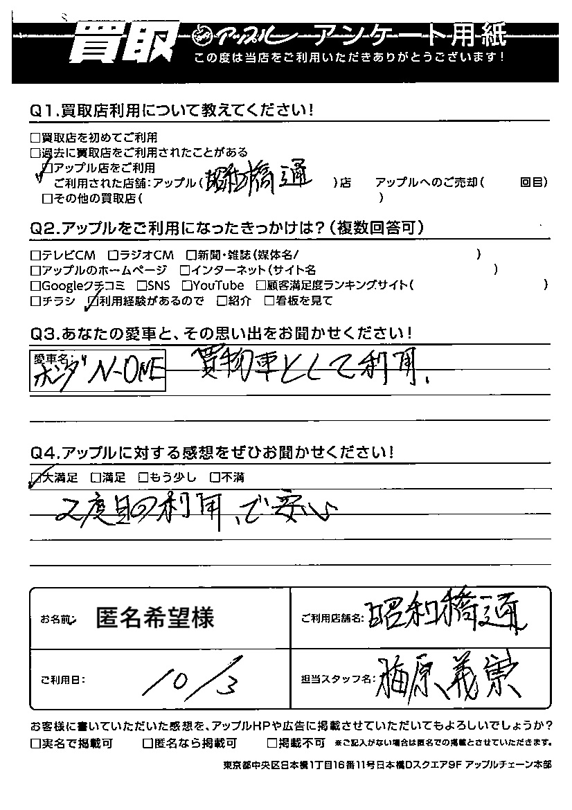 A.愛車名:ホンダ N-ONE 買い物車として利用