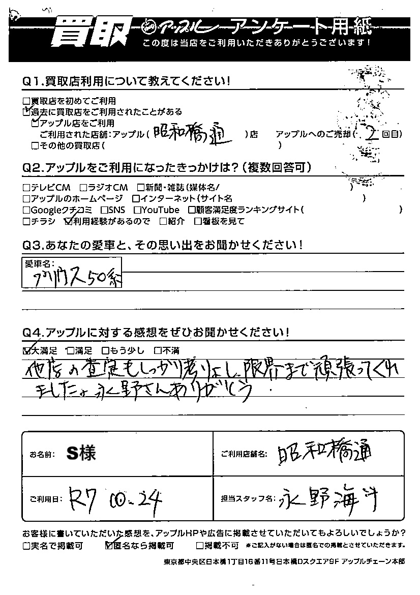 他店の査定もしっかり考慮し、限界まで頑張ってくれました。永野さんありがとう。