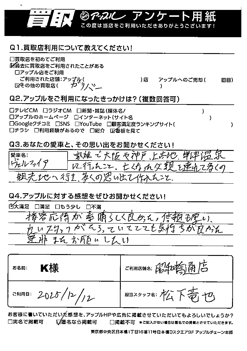 A.愛車名:ヴェルファイア 家族で大阪や神戸、上高地・草津温泉に行ったこと。亡くなった父親を連れて多くの観