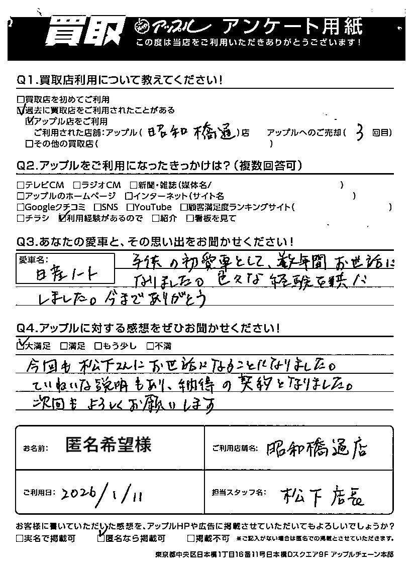 A.愛車名:ノート 今回も松下さんにお世話になることになりました。ていねいな説明もあり、納得の契約となりま