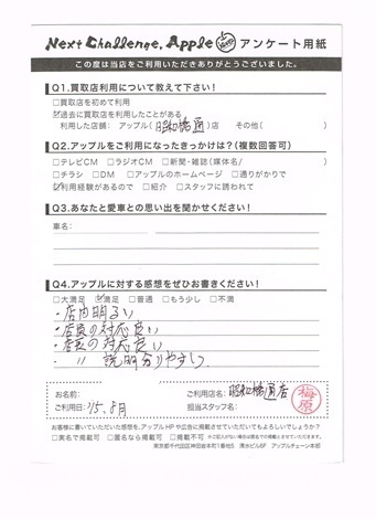 お車のご相談・ 査定だけでもOK! カンタン 入力 30秒 アップルがブランド買取始めました! お電話でも受付中! 受付時間10:00 ~ 19:00 052-363-7811 お車のご相談・ 査定だけでもOK! カンタン 入力 30秒 アップルがブランド買取始めました! お電話でも受付中! 受付時間10:00 ~ 19:00 052-363-7811 アップルがブランド買取始めました! お電話でも受付中! 受付時間10:00 ~ 19:00 052-363-7811 店舗情報 在庫車 スタッフ紹介 ブログ お客様の声 キャンペーン 無料査定 click お客様の声 ご記入日: 2015/08/01 匿名希望様 ・店内明るい・店員の対応良い・店長の対応良い・店長の説明わかりすい 前へ 次へ お客様の声一覧を見る