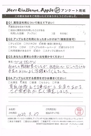 お車のご相談・ 査定だけでもOK! カンタン 入力 30秒 アップルがブランド買取始めました! お電話でも受付中! 受付時間10:00 ~ 19:00 052-363-7811 お車のご相談・ 査定だけでもOK! カンタン 入力 30秒 アップルがブランド買取始めました! お電話でも受付中! 受付時間10:00 ~ 19:00 052-363-7811 アップルがブランド買取始めました! お電話でも受付中! 受付時間10:00 ~ 19:00 052-363-7811 店舗情報 在庫車 スタッフ紹介 ブログ お客様の声 キャンペーン 無料査定 click お客様の声 ご記入日: 2015/09/27 匿名希望スティングレー様 買取価格もさる事ながらお店の明るさや雰囲気が良く満足しました。 前へ 次へ お客様の声一覧を見る