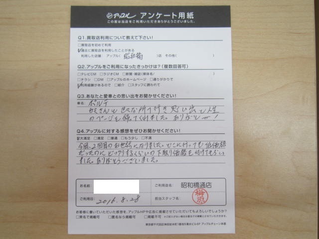 お車のご相談・ 査定だけでもOK! カンタン 入力 30秒 アップルがブランド買取始めました! お電話でも受付中! 受付時間10:00 ~ 19:00 052-363-7811 お車のご相談・ 査定だけでもOK! カンタン 入力 30秒 アップルがブランド買取始めました! お電話でも受付中! 受付時間10:00 ~ 19:00 052-363-7811 アップルがブランド買取始めました! お電話でも受付中! 受付時間10:00 ~ 19:00 052-363-7811 店舗情報 在庫車 スタッフ紹介 ブログ お客様の声 キャンペーン 無料査定 click お客様の声 ご記入日: 2016/08/28 匿名希望ポルテ様 今回、2回目のお世話になりました。どこに行っても低価格だったのにビックリするくらいの下取り価格をつけてもらいました。ありがとうございました。 前へ 次へ お客様の声一覧を見る