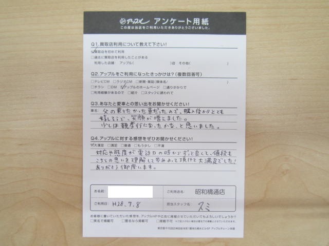お車のご相談・ 査定だけでもOK! カンタン 入力 30秒 アップルがブランド買取始めました! お電話でも受付中! 受付時間10:00 ~ 19:00 052-363-7811 お車のご相談・ 査定だけでもOK! カンタン 入力 30秒 アップルがブランド買取始めました! お電話でも受付中! 受付時間10:00 ~ 19:00 052-363-7811 アップルがブランド買取始めました! お電話でも受付中! 受付時間10:00 ~ 19:00 052-363-7811 店舗情報 在庫車 スタッフ紹介 ブログ お客様の声 キャンペーン 無料査定 click お客様の声 ご記入日: 2016/07/08 匿名希望アルファロメオ様 対応や態度が電話口の時からずっと良くて、値段もこちらの思いを理解して歩みよって頂けて大満足でした!ありがとう御座います。 前へ 次へ お客様の声一覧を見る