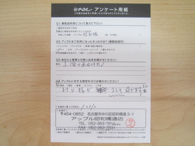 お車のご相談・ 査定だけでもOK! カンタン 入力 30秒 アップルがブランド買取始めました! お電話でも受付中! 受付時間10:00 ~ 19:00 052-363-7811 お車のご相談・ 査定だけでもOK! カンタン 入力 30秒 アップルがブランド買取始めました! お電話でも受付中! 受付時間10:00 ~ 19:00 052-363-7811 アップルがブランド買取始めました! お電話でも受付中! 受付時間10:00 ~ 19:00 052-363-7811 店舗情報 在庫車 スタッフ紹介 ブログ お客様の声 キャンペーン 無料査定 click お客様の声 ご記入日: 2016/01/31 匿名希望ハリアー様 村上様がステキ過ぎます☆ミ 前へ 次へ お客様の声一覧を見る